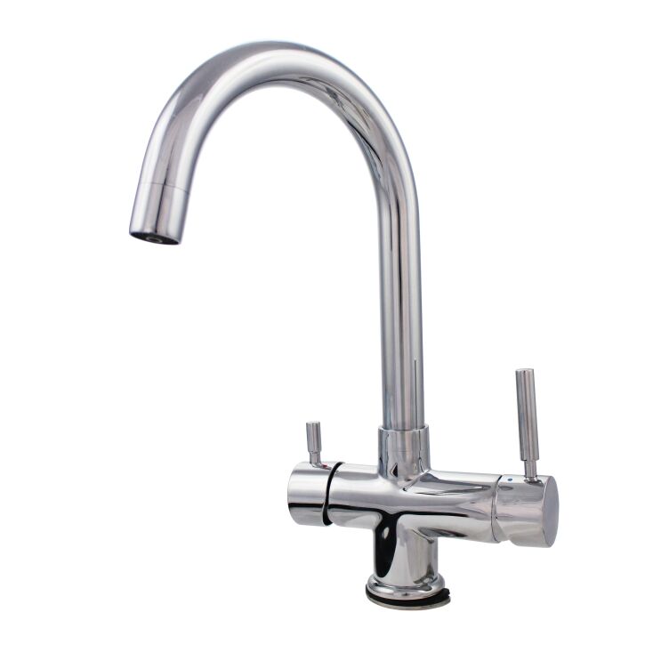 Bateria kuchenna 4-drożna 4YOU w eleganckim wykończeniu chrom to rozwiązanie, które pozwala uporządkować przestrzeń przy zlewie i podnieść komfort codziennego użytkowania. Umożliwia korzystanie z czterech rodzajów wody: ciepłej, zimnej oraz filtrowanej (np. czystej i mineralizowanej), bez konieczności montowania dodatkowego kranika. Wszystko masz pod ręką – wygodnie i estetycznie.