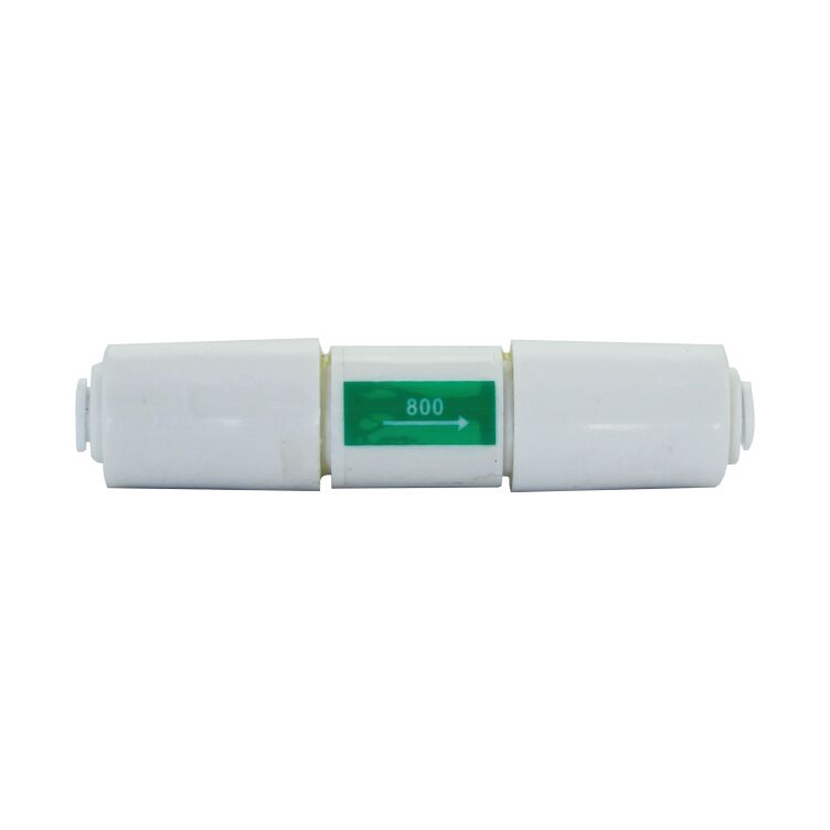 Ogranicznik przepływu 800 ml/min 1/4" wężyk, stosowany do membran od 150 Gpd, zakończony szybkozłączkami o średnicy wyjścia 1/4" pod wężyk. Ogranicznik służy do wymuszenia prawidłowego ciśnienia na pracę membrany odwróconej osmozy.