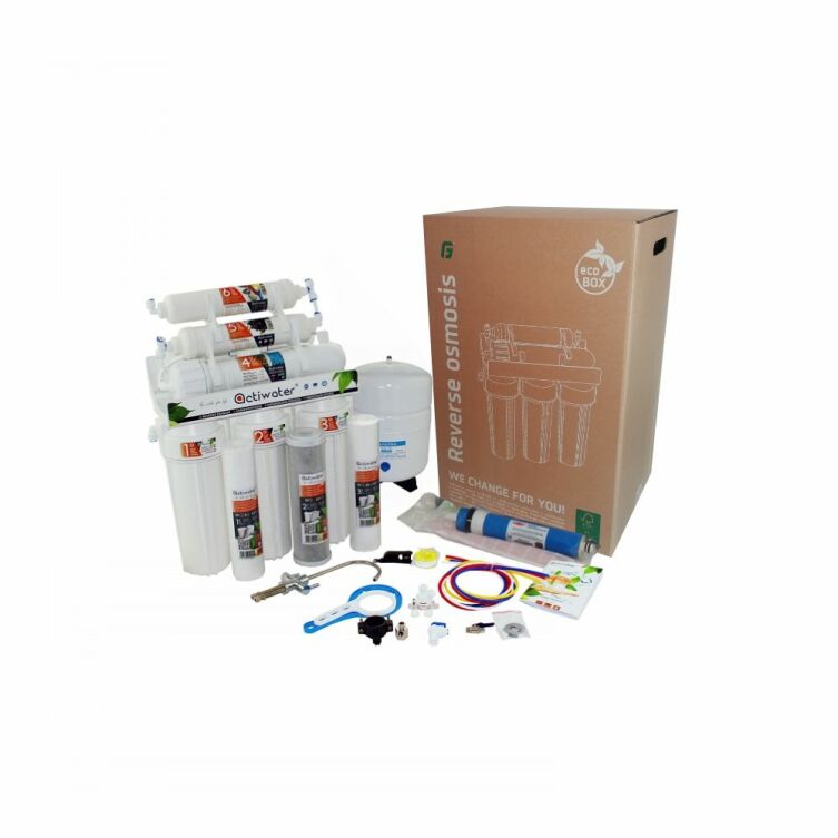 System Odwróconej Osmozy RO6 ACTIWATER PREMIUM posiada trzy wkłady do wstępnej filtracji wody - sedymentacyjne C10P20 i C10P5, które oczyszczają wodę z rdzy, piasku i zawiesin oraz węglowy C10CB, który oczyszcza wodę z chloru, substancji organicznych oraz niektórych pestycydów. Dzięki zastosowaniu markowej membrany osmotycznej 100gdp, możliwe jest usunięcie do 99% wszelkiego zanieczyszczenia większych od 0.001 µm oraz niektórych wirusów i bakterii.