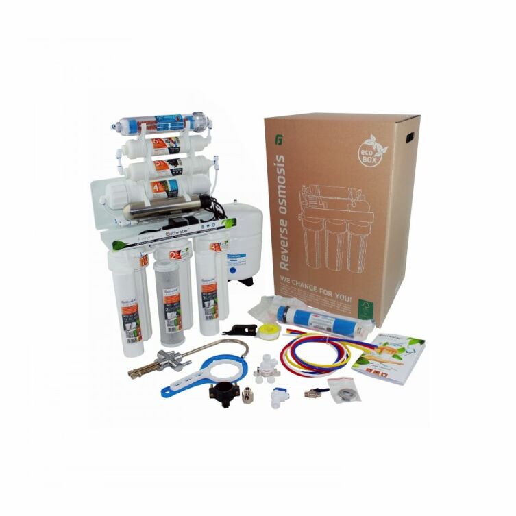 System Odwróconej Osmozy RO8 ACTIWATER PREMIUM posiada trzy wkłady do wstępnej filtracji wody - sedymentacyjne C10P20 i C10P5, które oczyszczają wodę z rdzy, piasku i zawiesin oraz węglowy C10CB, który oczyszcza wodę z chloru, substancji organicznych oraz niektórych pestycydów. Dzięki zastosowaniu markowej membrany osmotycznej 100gdp, możliwe jest usunięcie do 99% wszelkiego zanieczyszczenia większych od 0.001 µm oraz niektórych wirusów i bakterii.