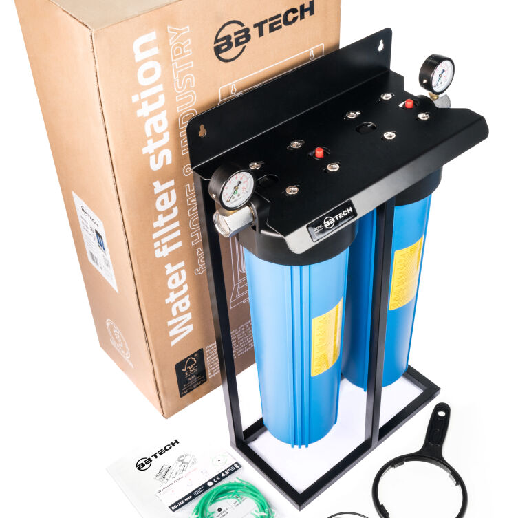 Zadbaj o czystą wodę w całym domu lub firmie dzięki systemowi narurowemu Big Blue 2×20 BBTECH Z MANOMETRAMI — profesjonalnej stacji filtrującej, która skutecznie usuwa zanieczyszczenia i zapewnia bezpieczeństwo wody!