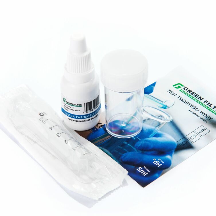 Tester kropelkowy badanie twardości wody. Prosty i szybki sposób na dokonanie szybkiego pomiaru twardości wody, podany wynik w stopniach niemieckich poprzez zmianę koloru widy po dodaniu odpowiedniej ilości kropel odczynnika do badanej wody.