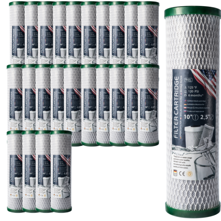 Wkład węglowy blok 10" 2,5" – 25 sztuk, filtr do wody usuwający chlor i zanieczyszczenia