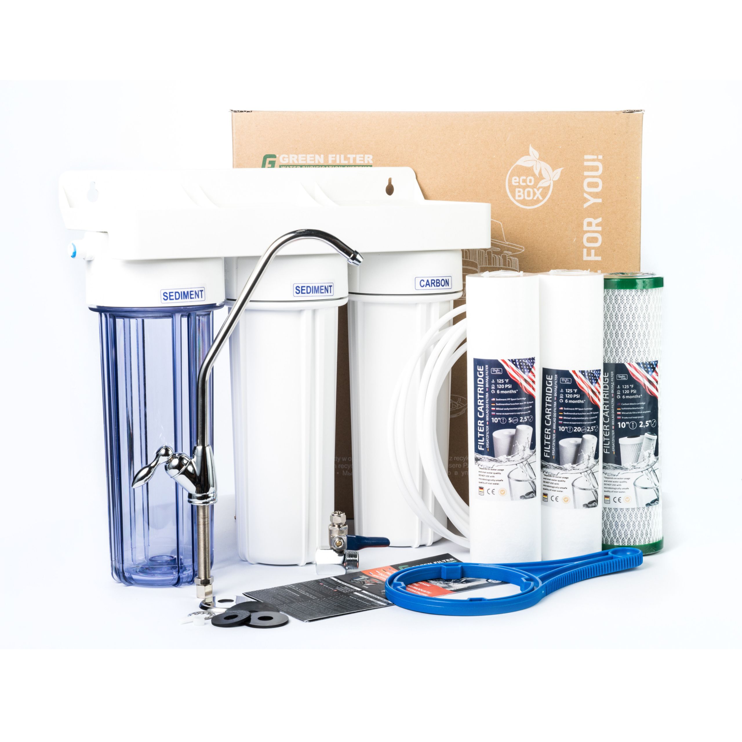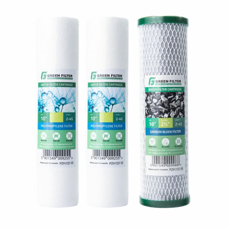 Gotowy komplet wkładów do wymiany w potrójnym systemie filtracji wody montowanym pod zlewozmywakiem, komplet składa się z dwóch wkładów sedymentacyjnych tzw. piankowych o mikronażu 20 C10P20 i 5 C10P5 mikronów oraz jednego wkładu węglowego tzw. bloku węglowego C10CB, wkład ten oporawia smak i zapach wody eliminując głównie chlor oraz wiele innych zanieczyszczeń organicznych.
