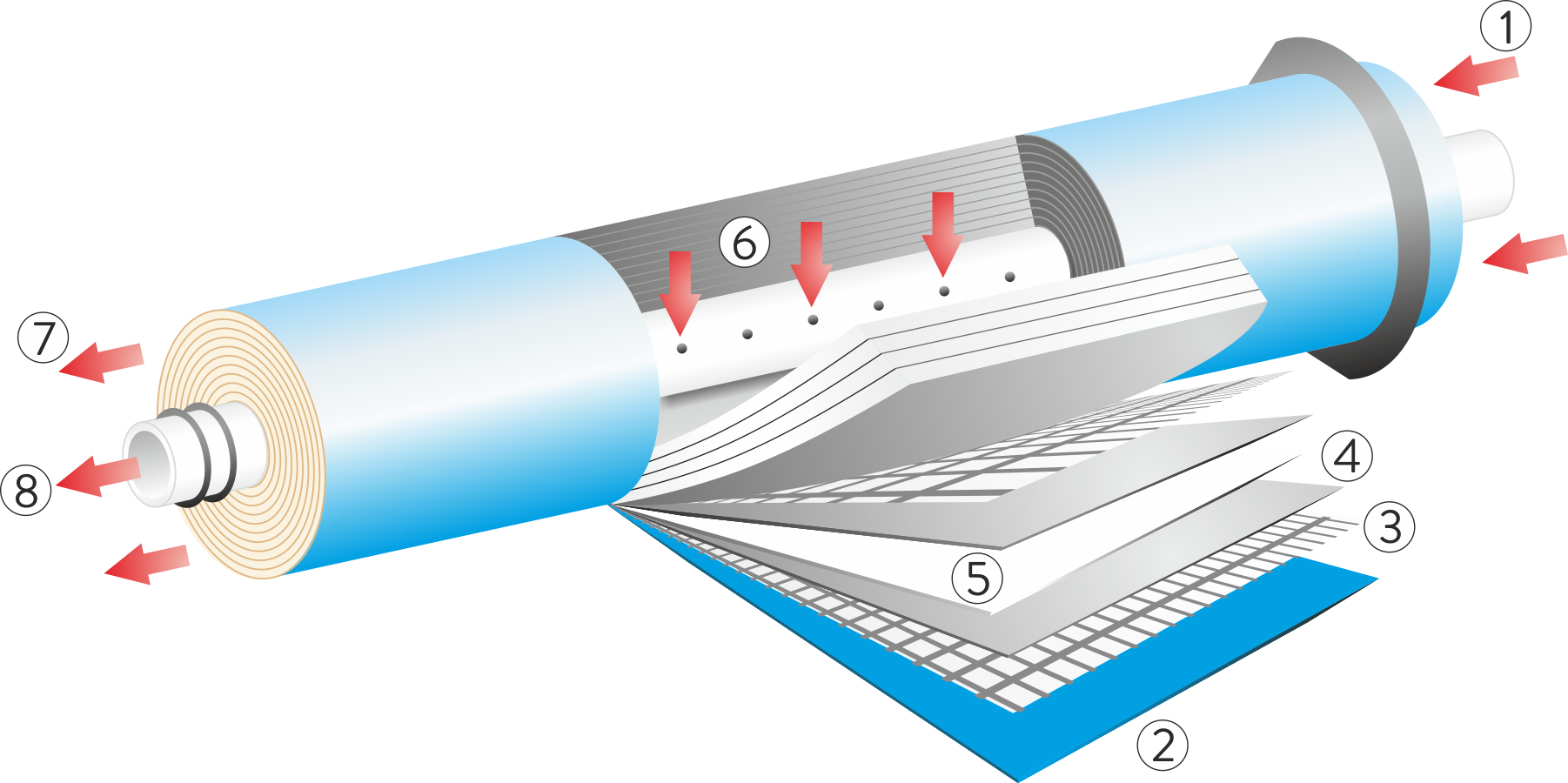 Membrana osmotyczna składa się z wielu warstw, które są nawinięte na trzpień w środku membrany. Woda zanieczyszczona pod ciśnieniem wtłaczana jest na powierzchnię membrany. Cząstki wody przedostają się przez mikroskopijne pory na powierzchni warstw filtrujących. Po oddzieleniu zanieczyszczeń, trafiają one do odpływu, a woda oczyszczona przedostaje się przez otwory trzpienia do centralnego kanału membrany i stamtąd pod wpływem ciśnienia wypływa.