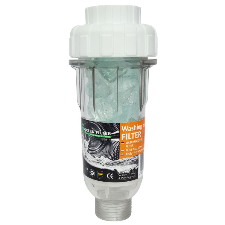 Filtr pralkowy do wody zimnej, montowany w miejscu zasilania pralki. Chroni elementy grzewcze, przedłuża żywotność pralki, zabezpiecza przed osadzeniem się kamienia. Zmniejsza zużycie detergentów, dzięki zawartości +/- 100 g polifosfatu. Posiada przyłącze - gwint wewnętrzny 3/4". Zaletą filtra jest ochrona części grzewczych w urządzeniach AGD łatwość montażu. Żywotność wkładu określona indywidualnie od jakości wody i ilości jej zużycia, lub 1 roku. Filtr ten montujemy po między wężem doprowadzającym wodę do pralki a zaworem zasilającym pralkę, przyłącze filtra to 3/4GZ x 3/4GW