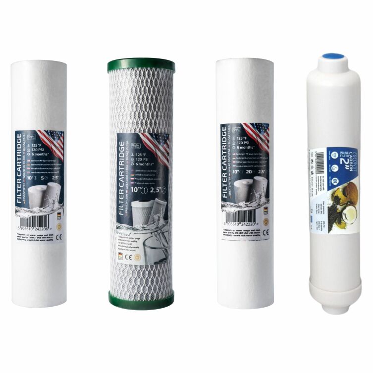 Gotowy komplet wkładów do wymiany w systemie filtracji osmotycznej RO5, montowanym pod zlewozmywakiem, komplet składa się z jednego wkładu wstępnego oczyszczania tzw. piankowego 20 mikronów C10P20 oraz wkładu węglowego tzw. bloku węglowego C10CB, wkład ten eliminuje głównie chlor oraz wiele innych zanieczyszczeń organicznych, wkładu wstępnego piankowego 5 mikronów C10P5 który zabezpiecza membranę osmotyczną. Filtr szlifujący liniowy węglowy (C2ICC), jest wkładem po membranie osmotycznej poprawia smak i zapach wody.